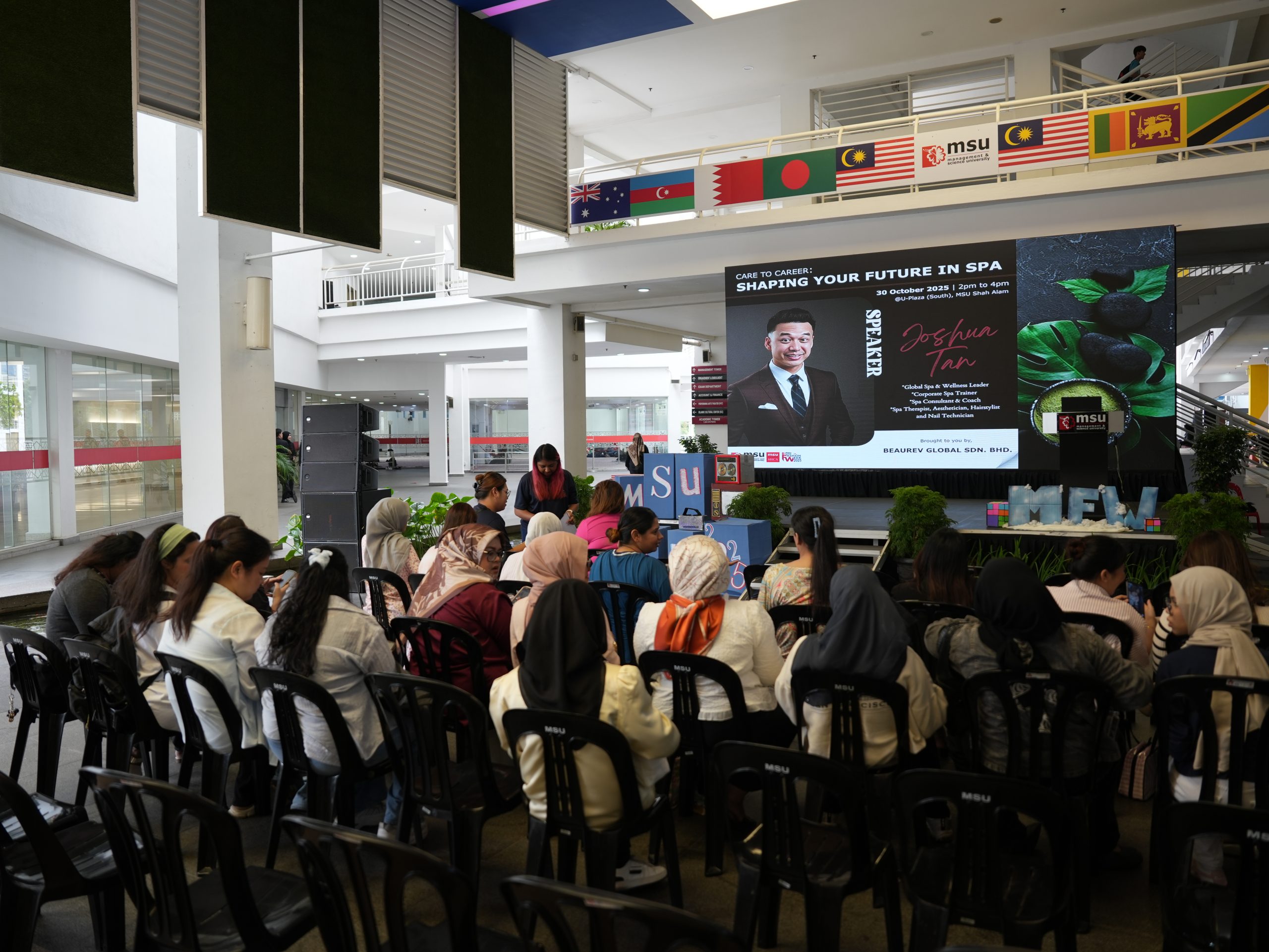 Beaurev Global proudly organised an industry sharing session at Management & Science University (MSU), welcoming students from MSU and GIATMARA Spa Management to explore real-world career opportunities in the spa and wellness field. Guided by wellness expert Joshua Tan, students were introduced to the ever-growing industry landscape, helping them understand how skills, professionalism, and passion can shape meaningful career journeys.
