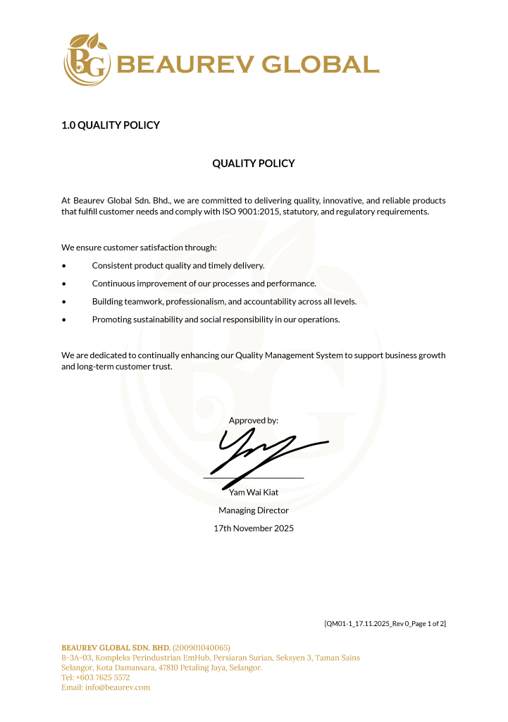 Measuring, monitoring, and reporting what matters is central to Beaurev Global’s CSR governance approach. Through structured tracking systems and internal metrics, including digital paper savings monitoring and recycling performance indicators, we ensure sustainability progress is measurable and accountable. This commitment is reinforced by our adherence to internationally recognised ISO standards, namely ISO 9001 for Quality Management. Together, these frameworks guide our operations to uphold continuous improvement, safeguard employee health and safety, strengthen environmental responsibility, and deliver reliable, customer-focused services that align people, planet, and performance under a unified governance structure.